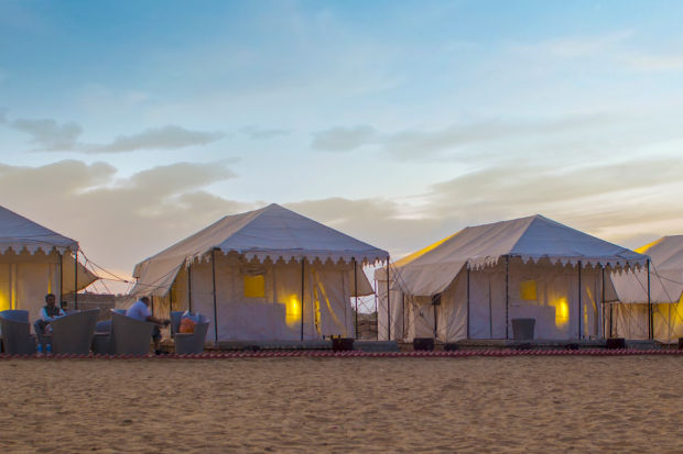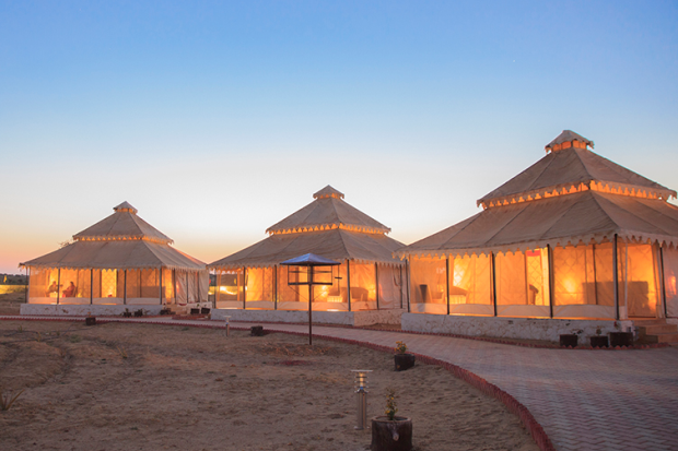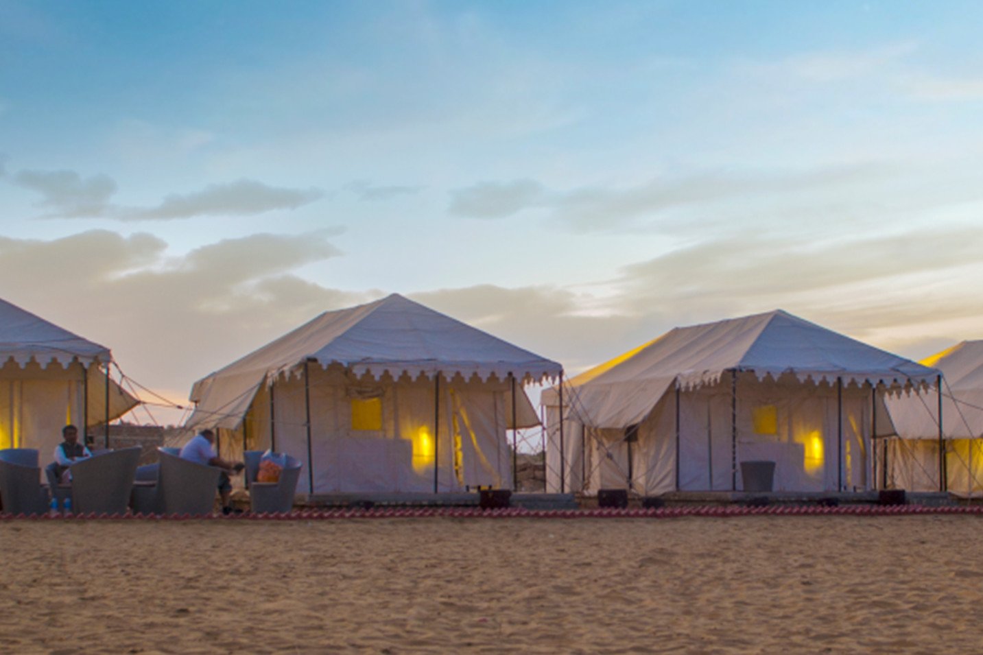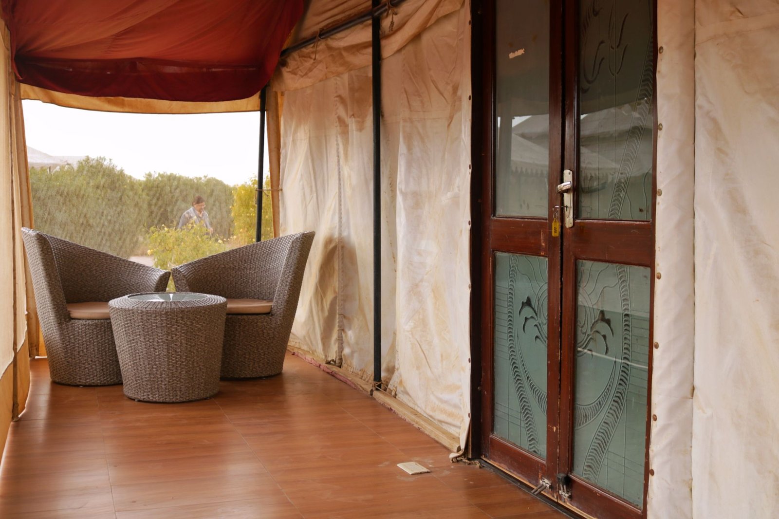 1. The comfort tents of which there are fifteen, are pitched on a soothing local jurassic yellow stone. Each has a veranda covered with net. Equipped with sitting arrangements to view the huge barren land.