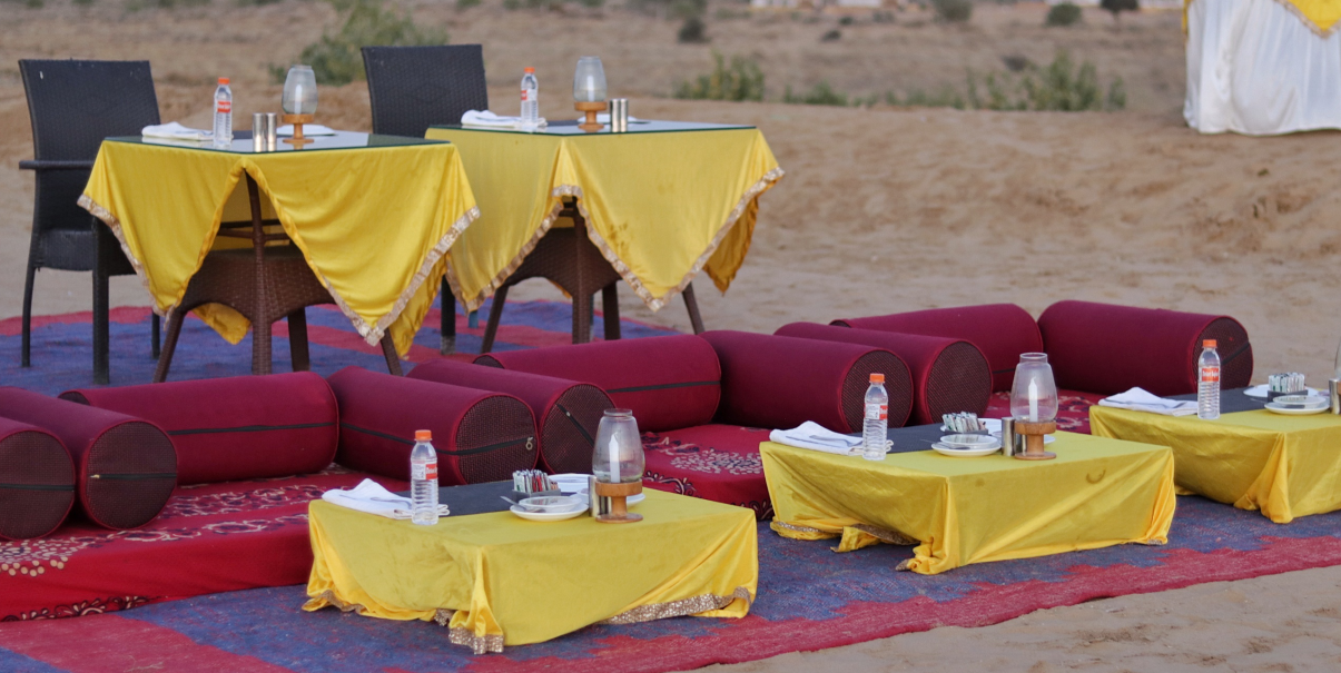 The distance of an ethnic village is around 8-10kms from the camp. So the ride would be a judicious mix of jeep & camel. After watching the glowing sunset, you shall be transported to the village by jeep directly from the dunes. Here the hardy villagers shall welcome you in their hoary way. Cuisine purely Rajasthani but authentic. Have a close look at the kitchen, equipment & the design of the house & the setup. A veiled lady cooks the Rajasthani cuisine live. You can drape yourself into the pure village cultures. The whole atmosphere is rustic & very Spartan for a different experience.